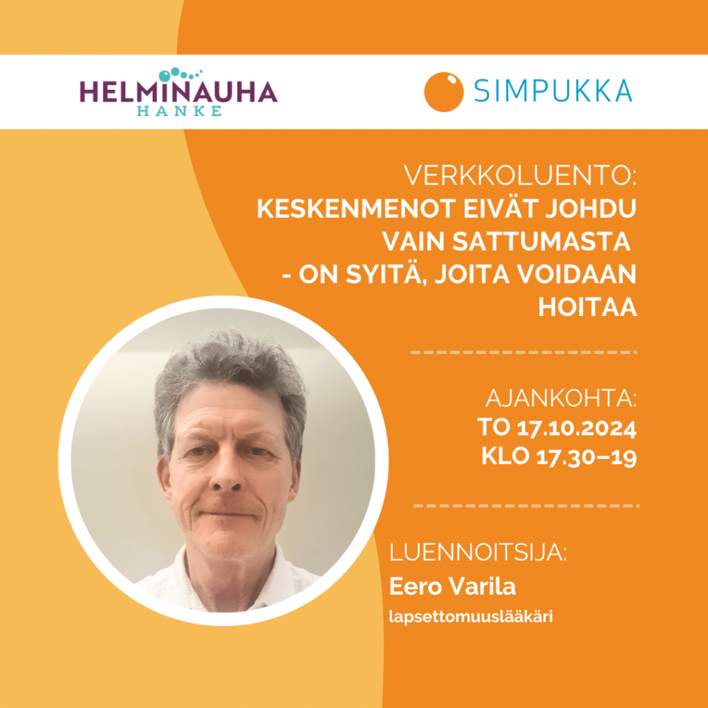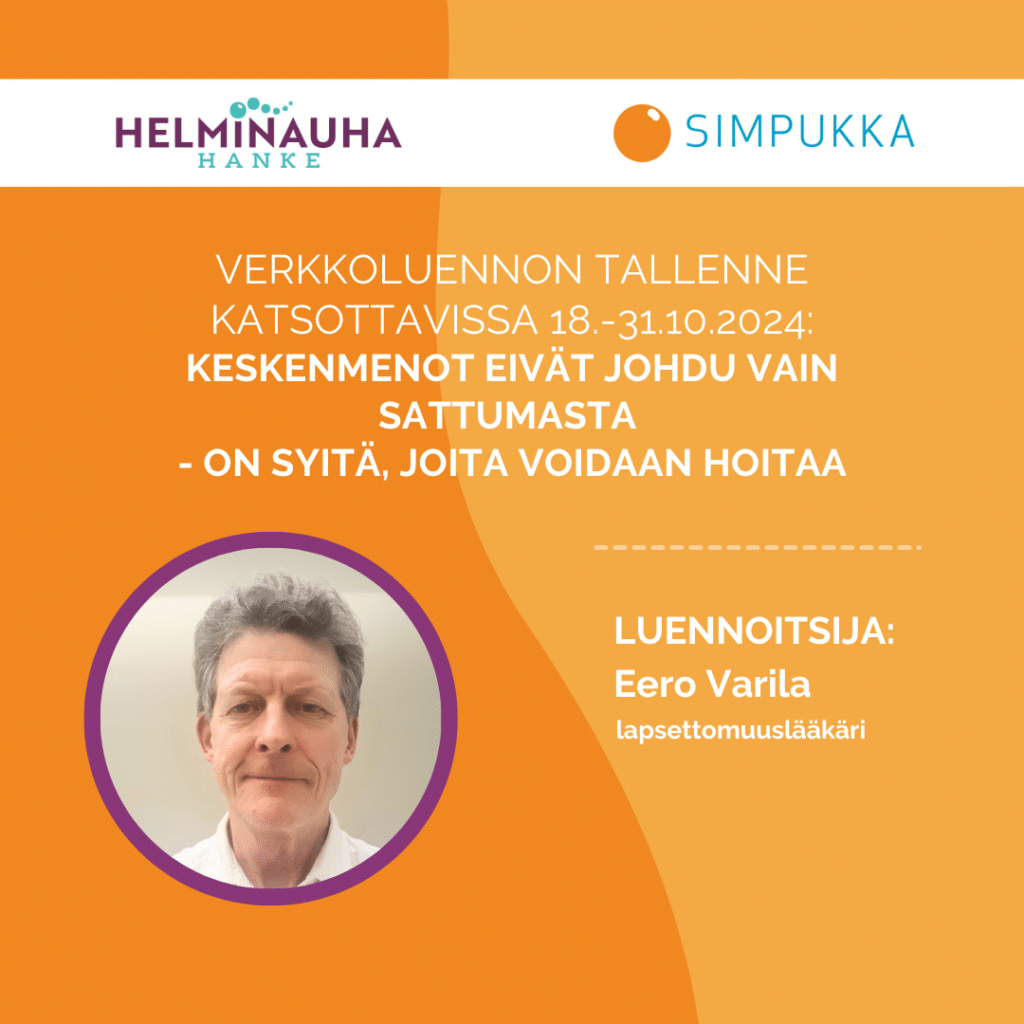 Verkkoluento 17.10.2024 Keskenmenot eivät johdu vain sattumasta – on syitä, joita voidaan hoitaa, luennoitsijana lapsettomuuslääkäri Eero Varila