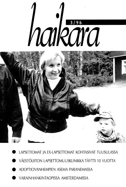 Vuonna 1996 järjestettiin ensimmäistä kertaa lapsettomien ja entisten lapsettomien tapaaminen. Tapahtumaan tuli 48 aikuista ja 20 lasta. Se oli Lapsettomien lauantai -tapahtumia lukuun ottamatta kaikkien aikojen paras osallistujamäärä yhdistyksen yksittäisessä tapahtumassa siihen mennessä. Muun muassa siellä sain kertoa perheeni adoptioprosesseista.