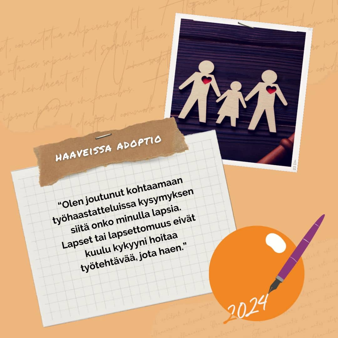 Tarinoita lapsettomuudesta: työelämä, adoptiopalvelut.