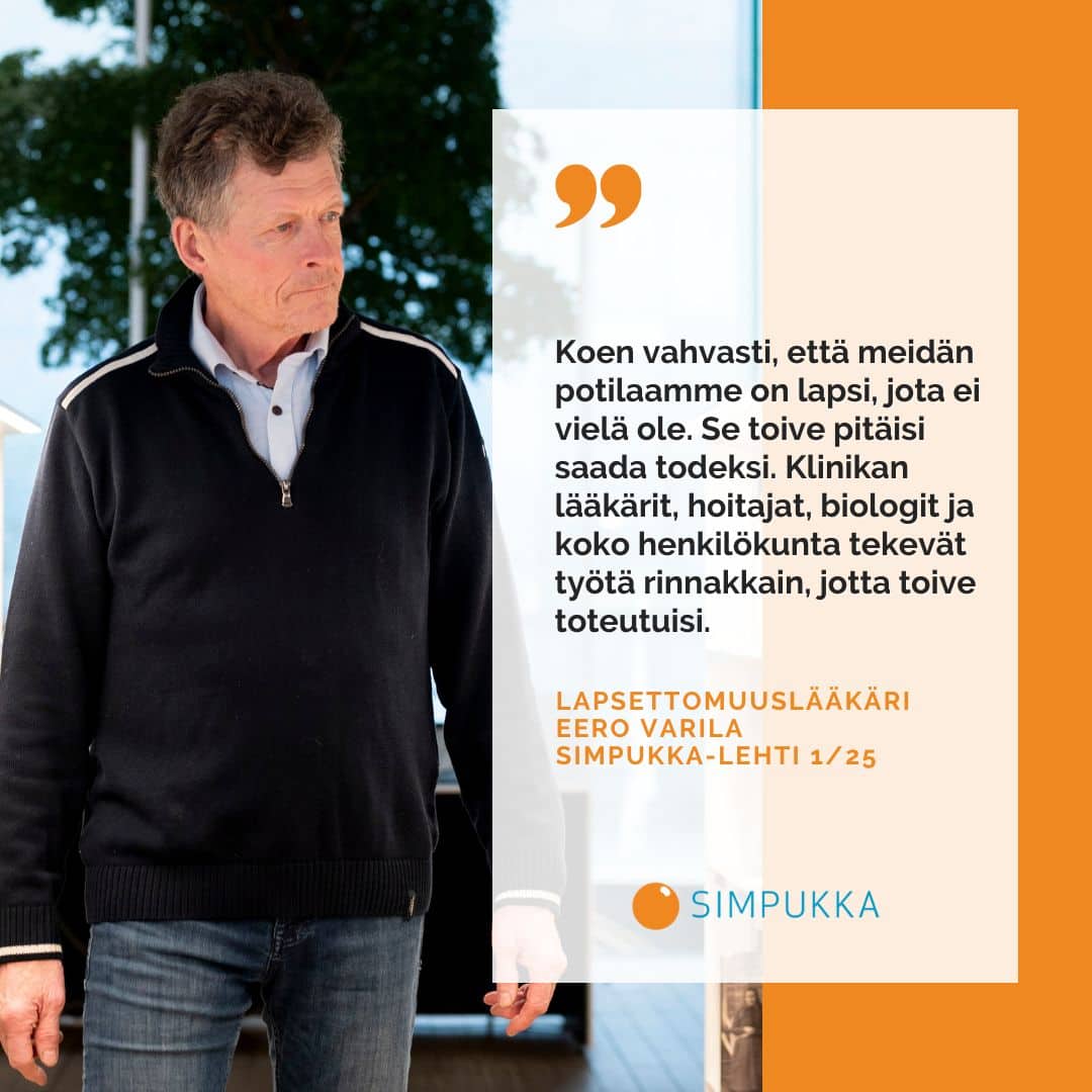 Lapsettomuuslääkärinä 1990-luvulla aloittanut Eero Varila on huolissaan lapsettomuusklinikoiden hoitotulosten eroista. Ammattilaisten osaamisen yhdistäminen, yhteiskunnan tuki ja yksilöllinen hoitopolku ovat avainasemassa lapsitoiveiden mahdollistamisessa. Simpukka ry myönsi pitkän linjan lapsettomuuslääkäri Eero Varilalle elämäntyöpalkinnon Lapsettomien lauantaina 10.5.2025.
