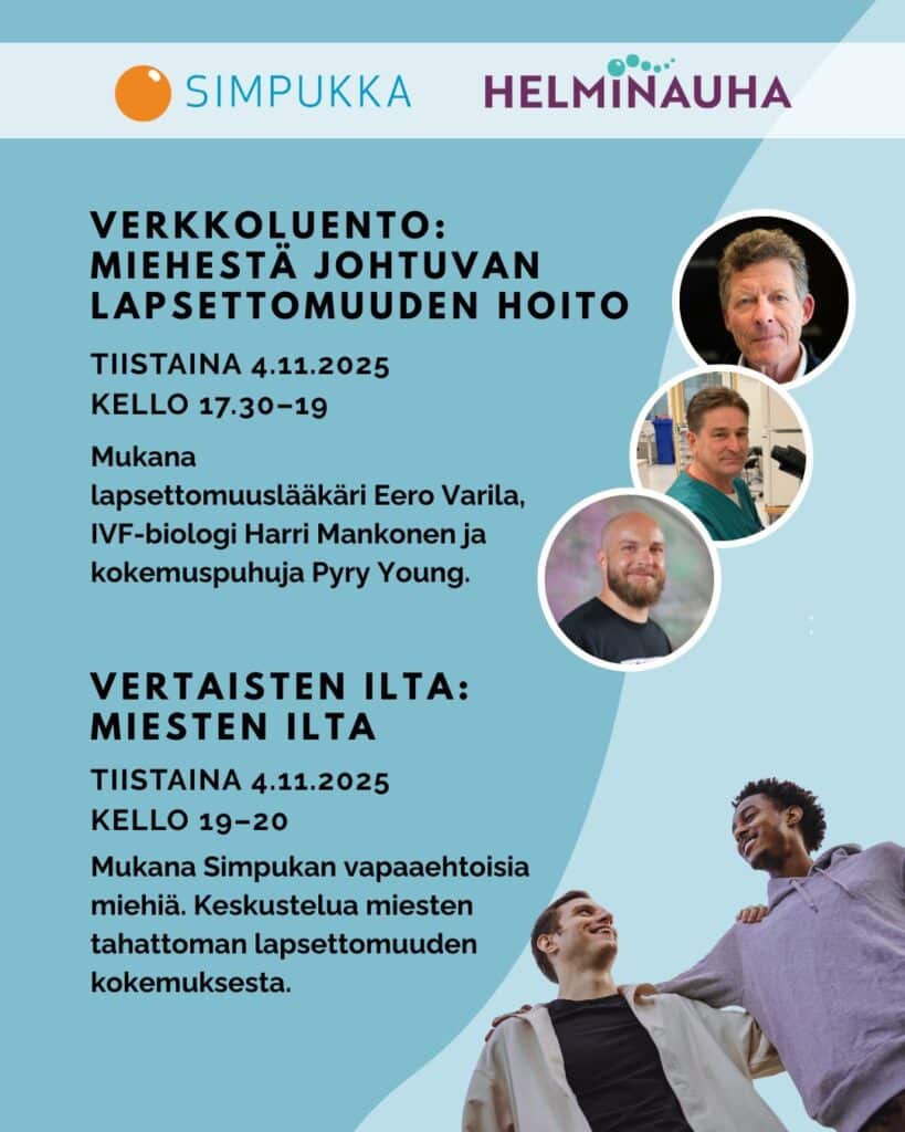 Tiistaina 4.11.2025 kello 19–20. Tahattoman lapsettomuuden kokeneille miehille sukupuolen moninaisuus huomioiden suunnattu vertaisten ilta, jota ohjaavat Simpukan vapaaehtoiset miehet. Mukaan pääsee avaamalla kameran ja mikrofonin.