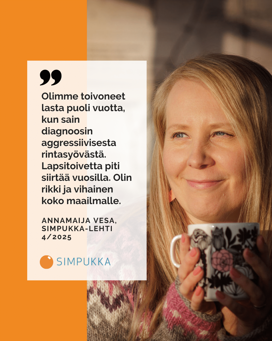 Olen saanut muutamaa viikkoa aikaisemmin diagnoosin aggressiivisesta rintasyövästä. Taso gradus 3 eli korkein pahanlaatuisuusaste. Syöpäsoluni jakautuvat nopeasti ja ovat voimakkaasti epäerilaistuneita. Olen 34-vuotias eikä ajatuksissani ole käynyt, että sairastuisin vakavasti – ainakaan rintasyöpään. Olen ajatellut rintasyövän liittyvän enemmän vanhempien naisten elämänvaiheisiin – sairastuihan mummunikin siihen vasta 76-vuotiaana.