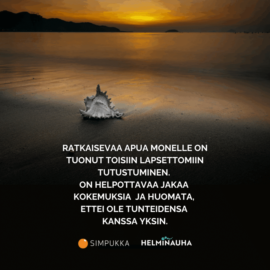 Ratkaisevaa apua on monelle tuonut toisiin lapsettomiin tutustuminen. On helpottavaa jakaa kokemuksia samassa tilanteessa olevien kanssa ja huomata, ettei ole tunteidensa kanssa yksin.