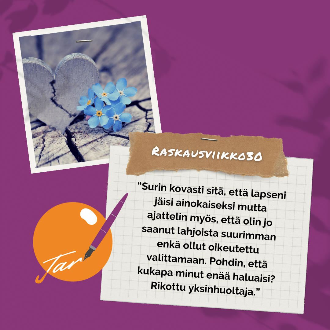Surin kovasti sitä, että lapseni jäisi ainokaiseksi mutta ajattelin myös, että olin jo saanut lahjoista suurimman enkä ollut oikeutettu valittamaan. Pohdin, että kukapa minut enää haluaisi? Rikottu yksinhuoltaja. Mutta me eläisimme kuitenkin hyvän elämän lapseni kanssa, se oli vain suurin tavoitteeni.