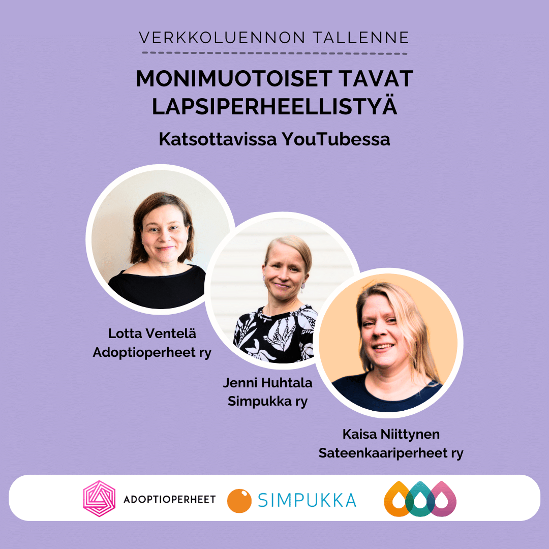 Monimuotoiset tavat lapsiperheellistyä-verkkoluentotallenne on nyt katsottavissa YouTubessa. Luento toteutettiin Simpukan, Sateenkaariperheet ry:n ja Adoptioperheet ry:n yhteistyönä Zoomissa tiistaina 29. huhtikuuta.