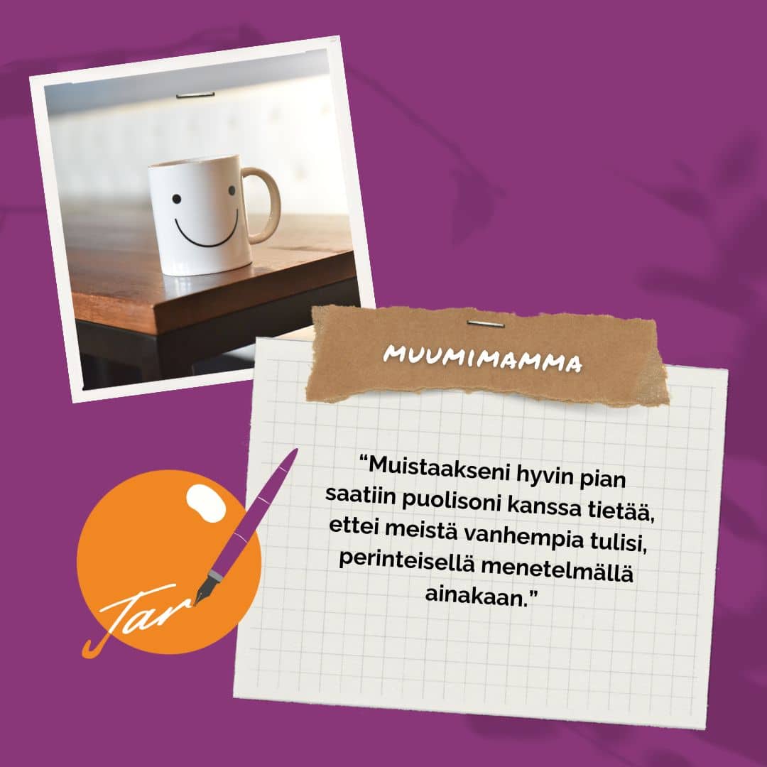 Muumimuki tepsi siis meillä, ainakin noin joka toisella kerralla. Lapset jo aikuisia ja isovanhemmiksikin olemme tulleet. Lapset tietävät miten ovat alkunsa saaneet. Mieleeni on jäänyt Väestöliiton klinikalta erään lääkärin leikillään sanomat sanat: “Olet pitänyt meitä pilkkanasi”.