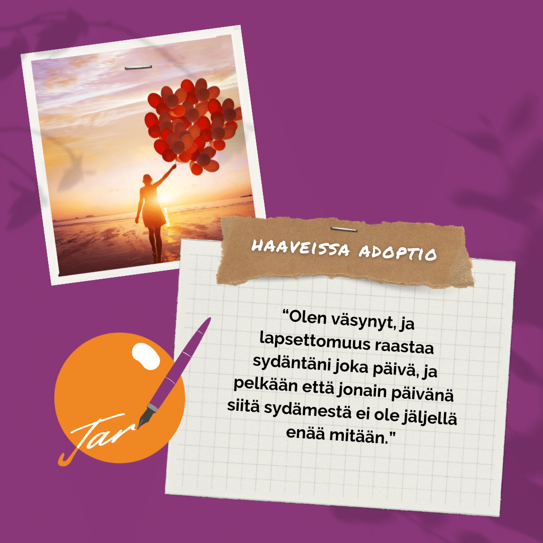 Olemme pian odottaneet lasta adoptiosta 7 vuotta. Olen väsynyt, ja lapsettomuus raastaa sydäntäni joka päivä, ja pelkään että jonain päivänä siitä sydämestä ei ole jäljellä enää mitään. Kipu ei poistu koskaan se muuttaa muotoaan.