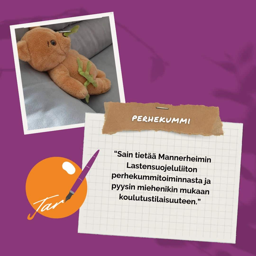 Olemme lapseton eläkeläispari ja tahdomme tavata pieniä lapsia, kun omia lastenlapsia ei ole ja sukulaisten lapsetkin ovat kasvaneet isoiksi. Sain tietää Mannerheimin Lastensuojeluliiton perhekummitoiminnasta ja pyysin miehenikin mukaan koulutustilaisuuteen. Toiminnan järjestäjä kertoi, että monta perhettä jonottaa kummia.