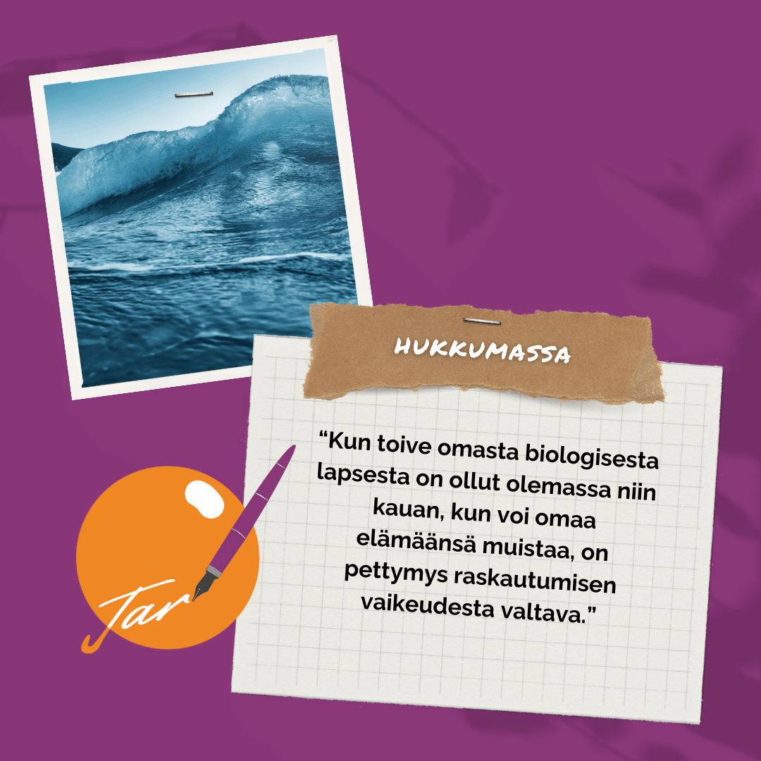 Olen yrittänyt elää vastuullisesti ja tehnyt paljon töitä sen eteen, että voisin edes harkita lasten hankkimista, jotta lapsillani olisi mahdollisimman hyvät lähtökohdat tähän elämään, itse kun en näitä ole saanut. Kun vihdoin tulee se hetki, että toive lapsen hankkimisesta konkretisoituu, on pettymyksen tunteet sanoinkuvaamattoman suuria, kun toiveet eivät toteudukaan.