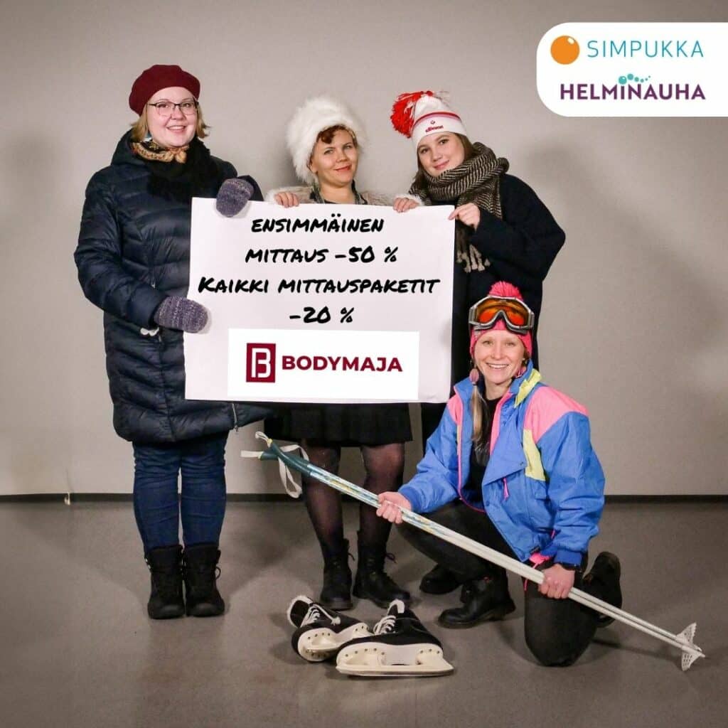 - Bodymaja tarjoaa Simpukan jäsenille ensimmäisestä testimittauksesta -50 % alennuksen. Kaikki mittauspaketit -20 %.