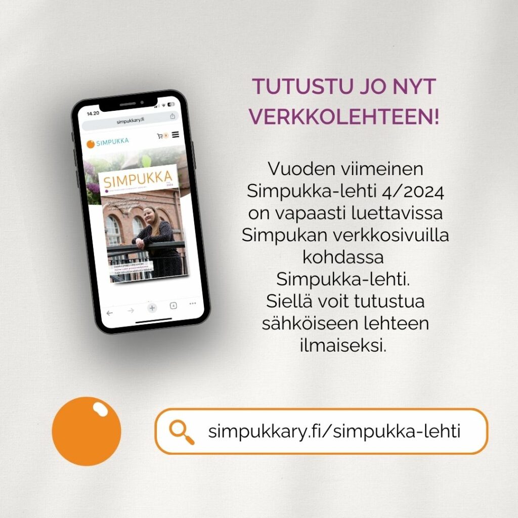 Simpukka-lehti on siirtynyt verkkoon! Jatkossa lehti ilmestyy sähköisenä, ja voit lukea lehteä esimerkiksi älypuhelimella, tabletilla tai tietokoneella. Lehti kulkee taskussasi tai laukussasi mukana ja siihen on helppo palata tarvittaessa.