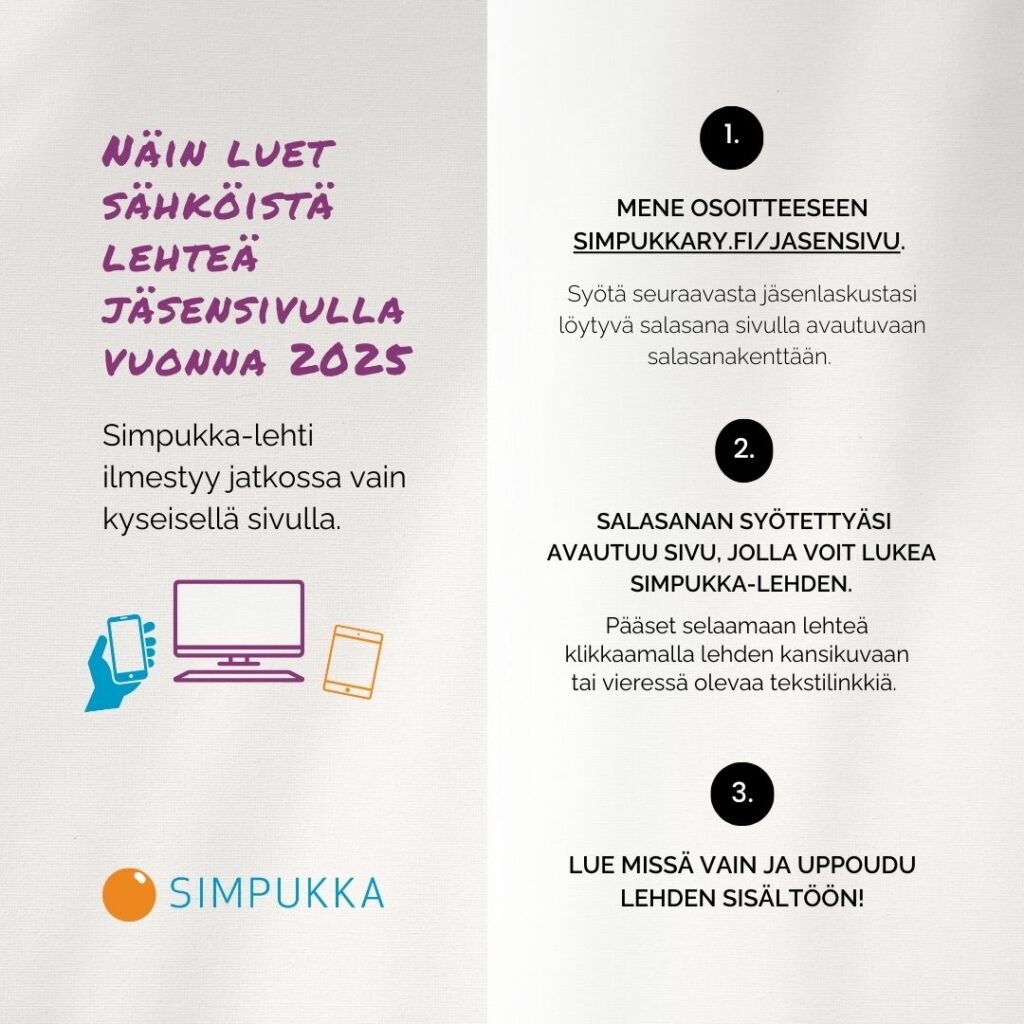 Jatkossa pääset lukemaan lehden kirjautumalla Simpukan verkkosivujen jäsensivulle. Lehteä lukeaksesi tarvitset salasanan. Saat sen tammikuun 2025 loppuun mennessä joko jäsenlaskustasi tai jäsenpostista. Odota postia meiltä rauhassa. Saatuasi salasanan mene osoitteeseen simpukkary.fi/jasensivu ja syötä sivulle salasana.