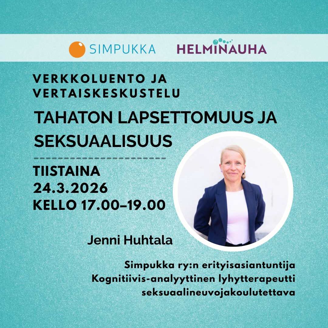 Tahaton lapsettomuus ja seksuaalisuus ovat verkkoluennon ja vertaistapaamisemme teemana maaliskuussa. Järjestäjänä Lapsettomien yhdistys Simpukka ry. Tervetuloa mukaan!