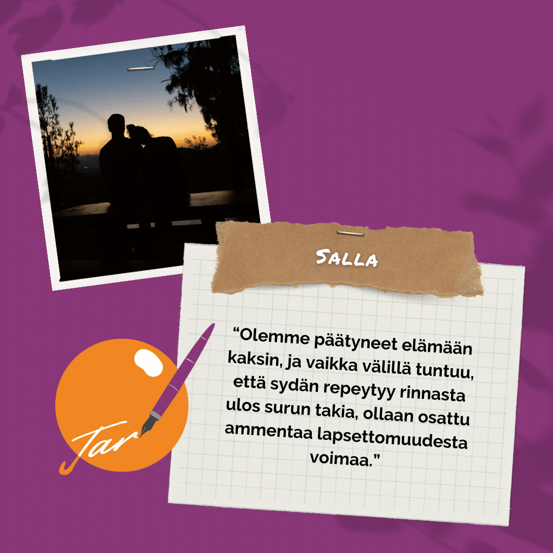 Olemme päätyneet elämään kaksin, ja vaikka välillä tuntuu, että sydän repeytyy rinnasta ulos surun takia, ollaan osattu ammentaa lapsettomuudesta voimaa. Ollaan rakennettu meidän oman näköinen elämä ja keskitytty asioihin, jotka ovat meille tärkeitä. Tuntuu siltä, että meitä, jotka eivät ole edes lähteneet hoitoihin, vaan ovat alkumetreillä todenneet tilanteen olevan näin ja hyväksyneet asian, ei ole montaa. Vertaistukea olen kaivannut monesti.