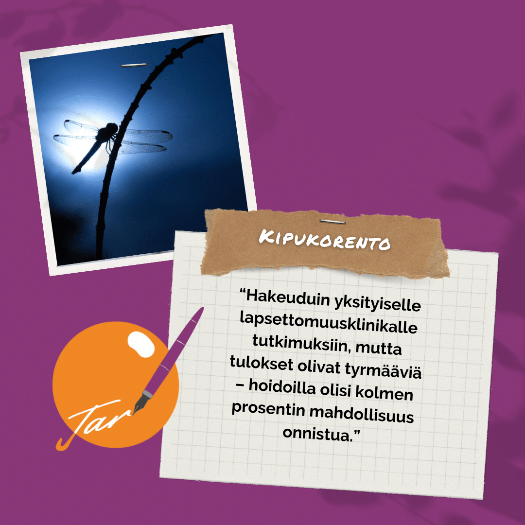 Hoidot alkoivat kaaoksen ja epätietoisuuden keskellä. Ne jäivät tuloksettomiksi ja keskeytettiin terveydellisistä syistä. Vuosi hoitojen päättymisestä minulla todettiin myös varhaiset vaihdevuodet.