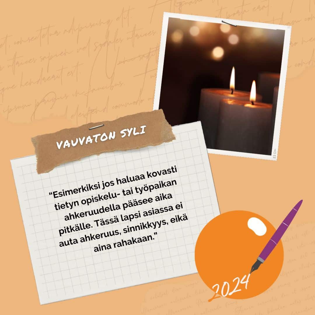 Jouluaattoillan olimme kahdestaan kotona. Mieheni kuunteli lempimusiikkiaan, minä sytytin kynttlän ja itkin sohvan nurkassa syntymätöntä lastamme. Emme tarvinneet sanoja, surimme molemmat tavallamme. Musiikki on ollut monena lapsenkaipuisena hetkenä suureksi avuksi. Se antaa surun yltyä täyteen mittaansa ja sen jälkeen lohduttaa.