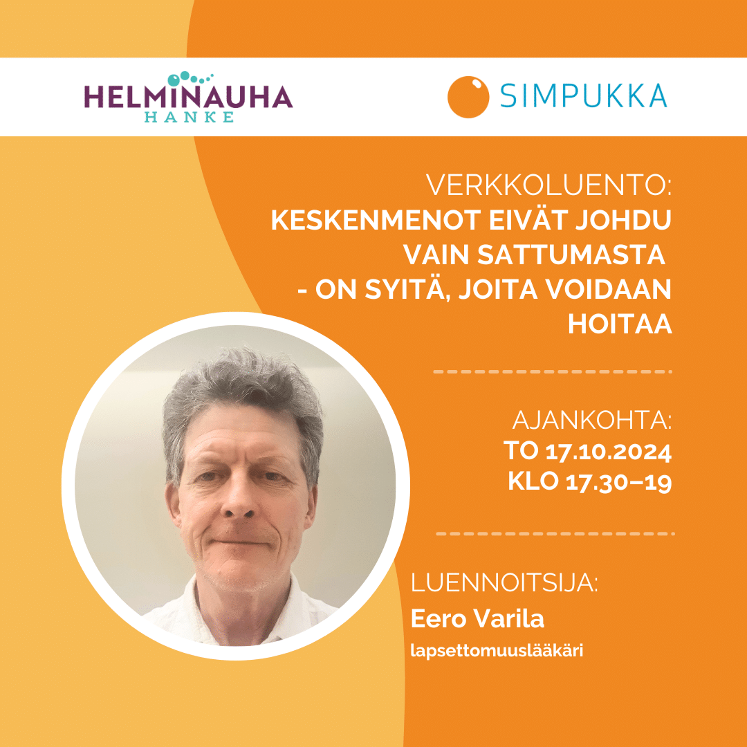 Lapsettomuuslääkäri Eero Varila luennoi Simpukan verkkoluennolla torstaina 17.10.2024 kello 17.30–19 aiheella Keskenmenot eivät johdu vain sattumasta – on syitä, joita voidaan hoitaa.