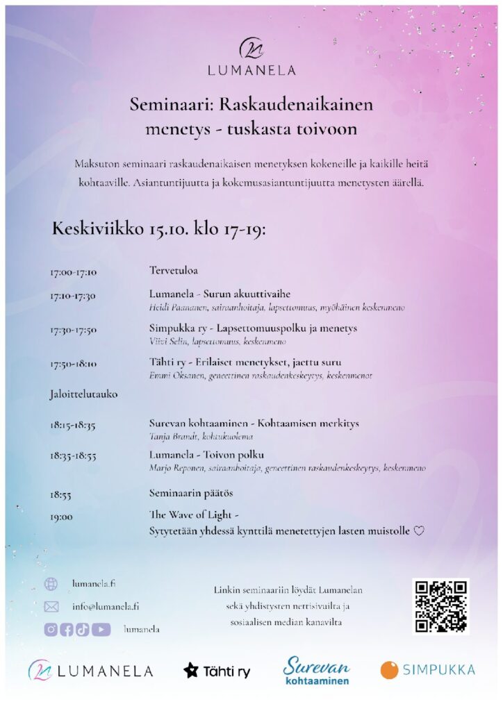 Lumanela järjestää verkkoseminaarin keskenmenon kokeneiden päivänä eli tähdenlentopäivänä 15.10.2025. Tilaisuus käsittelee raskaudenaikaista menetystä ja siihen liittyvää kokemusten kirjoa sekä toipumisen eri vaiheita.