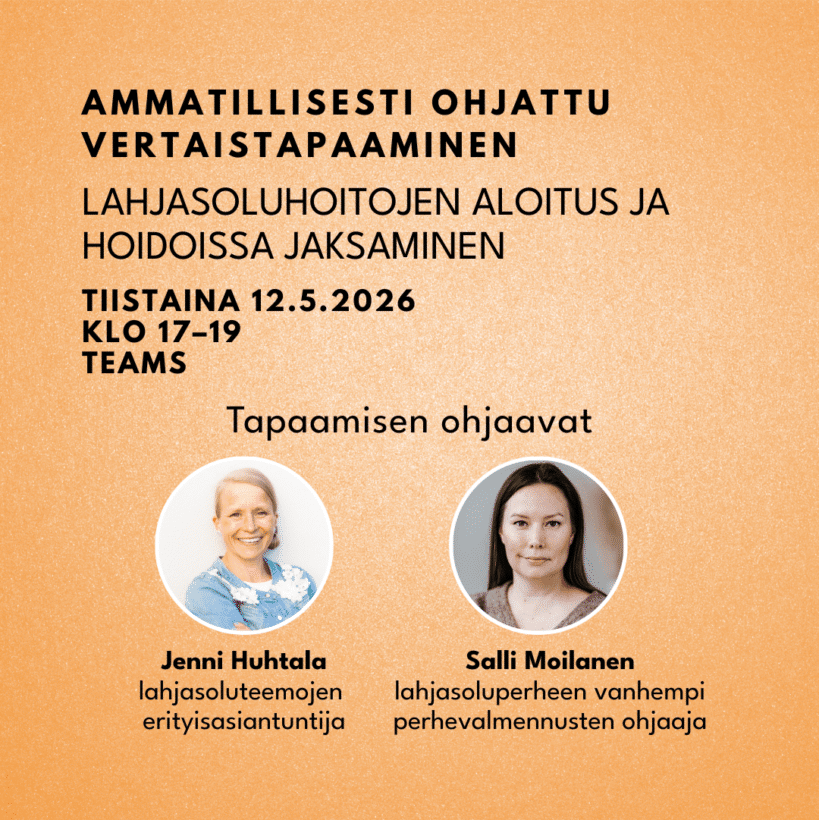 Tapaamisen ohjaajat Huhtala ja Moilanen tarjoavat tutkittua kokemustietoa lahjasoluhoidoista. Tapaamisen teemoista keskustellaan vertaisten kesken. Tapaaminen toteutetaan etänä, kaikilla osallistujilla on kamera päällä ja siihen osallistutaan rauhallisesta tilasta, jossa ei ole muita ihmisiä. Kuulokkeiden käyttäminen on suositeltavaa. Tapaamisessa noudatetaan Simpukka ry:n turvallisemman tilan periaatteita.