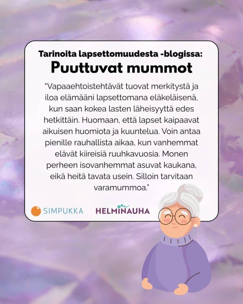 Lapsena minulla ei ollut mummolaa. Kaksi ystävääni kertoivat minulle, kuinka tärkeä mummo oli heille, kun…