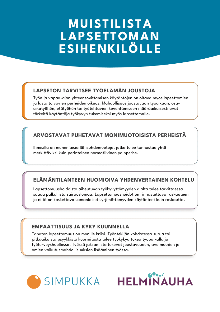 - Miten edistäisit lapsettomien ja lapsettomuushoidoissa käyvien hyvinvointia työpaikoilla?